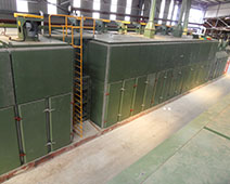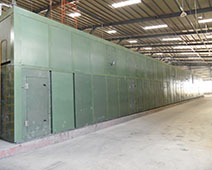 本機型采用大流量橫向循環離心式熱風機。其熱循環方式設計借鑒德國先進干燥機技術優點,新型鋼鋁復合翼片散熱器配專用矩形可變截面噴箱噴孔,使吹向左右單板表面的風速相同。石墨